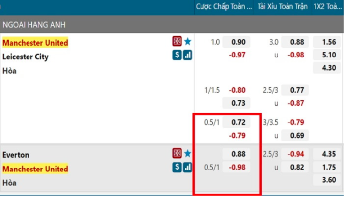 Ví dụ về kèo Châu Á có tỷ lệ 0.5-1 (vùng khoanh đỏ)